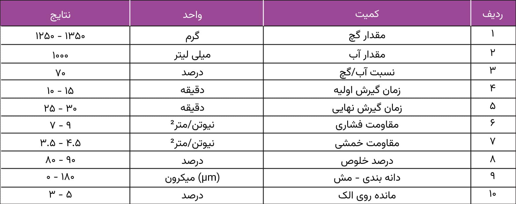 حداکثر زمان مصرف: ۳ ماه پس از تاریخ تولید. پس از باز شدن کیسه، محتویات باید ظرف یک هفته استفاده شود. تغییر زمان گیرش تنها با افزودنیهای کنترلشده در شرایط آزمایشگاهی امکانپذیر است. در صورت عدم افزودنی، نسبت آب به گچ قابل تغییر است: افزایش گچ = گیرش سریعتر / افزایش آب = گیرش کندتر. فقط از آب تمیز برای اختلاط استفاده شود. اجرای محصول در دمای کمتر از ۵ درجه سانتیگراد توصیه نمیشود